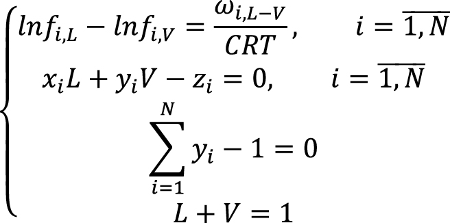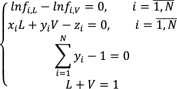 При моделировании многокомпонентной фильтрации для расчета равновесных составов и долей фаз смеси в каждом элементарном объеме необходимо решать систему уравнений, включающую условия равновесия и условия нормировки концентраций (Брусиловский, 2002; Whitson, Brule, 2000):