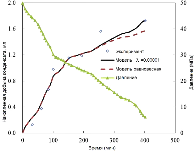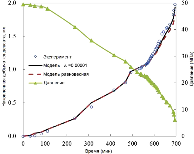 Рис. 5. Добыча конденсата при быстром истощении по результатам эксперимента, равновесного и неравновесного моделирования (Yang et al., 2020)