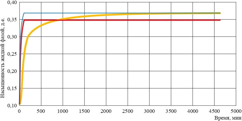 Сравнительные результаты моделирования приведены на рис. 13. Красным цветом показана динамика насыщенности жидкостью для традиционной неравновесной модели, синим – для равновесной модели, желтым – для релаксационной неравновесной модели.