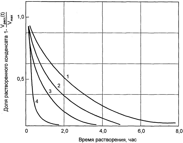 В качестве примера неравновесного фазового поведения углеводородной смеси, обусловленного сегрегацией фаз в локальном объеме, можно привести результаты экспериментов (Лапшин, 2001). Рассматривается обратное испарение ретроградной жидкости, выпавшей из газоконденсатных смесей с различным содержанием компонентов C5+ (рис. 1). Эксперимент предполагал снижение давления в однофазной газообразной системе до полного выпадения жидкой фазы. Затем давление поднимали до пластового (выше точки росы) и фиксировали динамику обратного испарения конденсата. Можно заметить, что чем больше содержание конденсата в системе, тем дольше происходит его переход в газообразное состояние. Отметим, что авторская подпись вертикальной оси на рис. 1 не вполне точная: отложена не доля растворенного конденсата, а ее дополнение до 1, т.е. доля выпавшего конденсата, остающегося в жидкой фазе к текущему моменту времени.