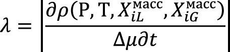 где для определения плотности смеси ρ и химических потенциалов µ используют аналитические соотношения, указывая при этом, что плотность и химические потенциалы зависят от давления Р, температуры Т и составов фаз XiGмасс, XiLмасс и должны определяться экспериментально. Очевидно, что данный подход для реального месторождения позволяет получить лишь приближенную оценку значений коэффициентов массопереноса.