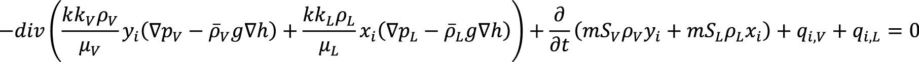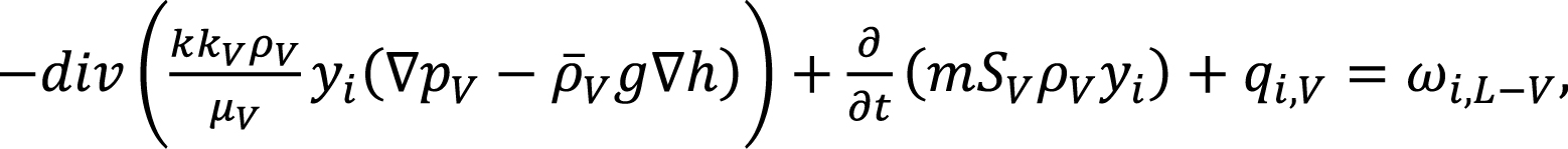 – массовая плотность; m – эффективная пористость; k – эффективная проницаемость (фазовая проницаемость для нефти при остаточной водонасыщенности); S – насыщенность, нормированная по эффективному поровому объему; yi, xi – мольная доля компонента i в паровой и жидкой фазах соответственно; qi – мольная интенсивность источников (стоков) компонента i; h – глубинная отметка данной точки, g – ускорение свободного падения, ωi,L-V – интенсивность межфазного потока i-го компонента (из жидкой фазы в паровую).