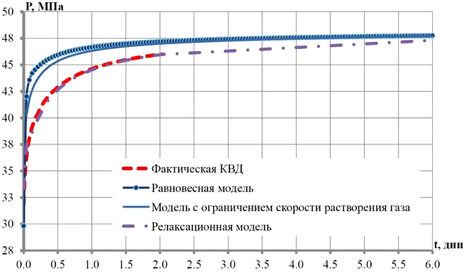 Рис. 12. Результат воспроизведения КВД с помощью релаксационной модели изменения газосодержания при неравновесном растворении газа (Индрупский и др., 2020)