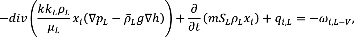 В модели уравнения неразрывности для учета баланса массы (числа молей) каждого компонента смеси записывают отдельно для всех сосуществующих углеводородных фаз. При этом в них вводится дополнительное слагаемое ωi,L-V , характеризующее интенсивность обмена данным компонентом между фазами: