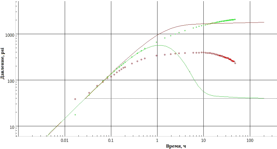 Рис. 11. Модельные (сплошные линии) и фактические (точки) зависимости изменения давления (красная линия, зеленые точки) и его логарифмической производной (зеленая линия, красные точки) от времени в билогарифмических координатах (Индрупский и др., 2020)