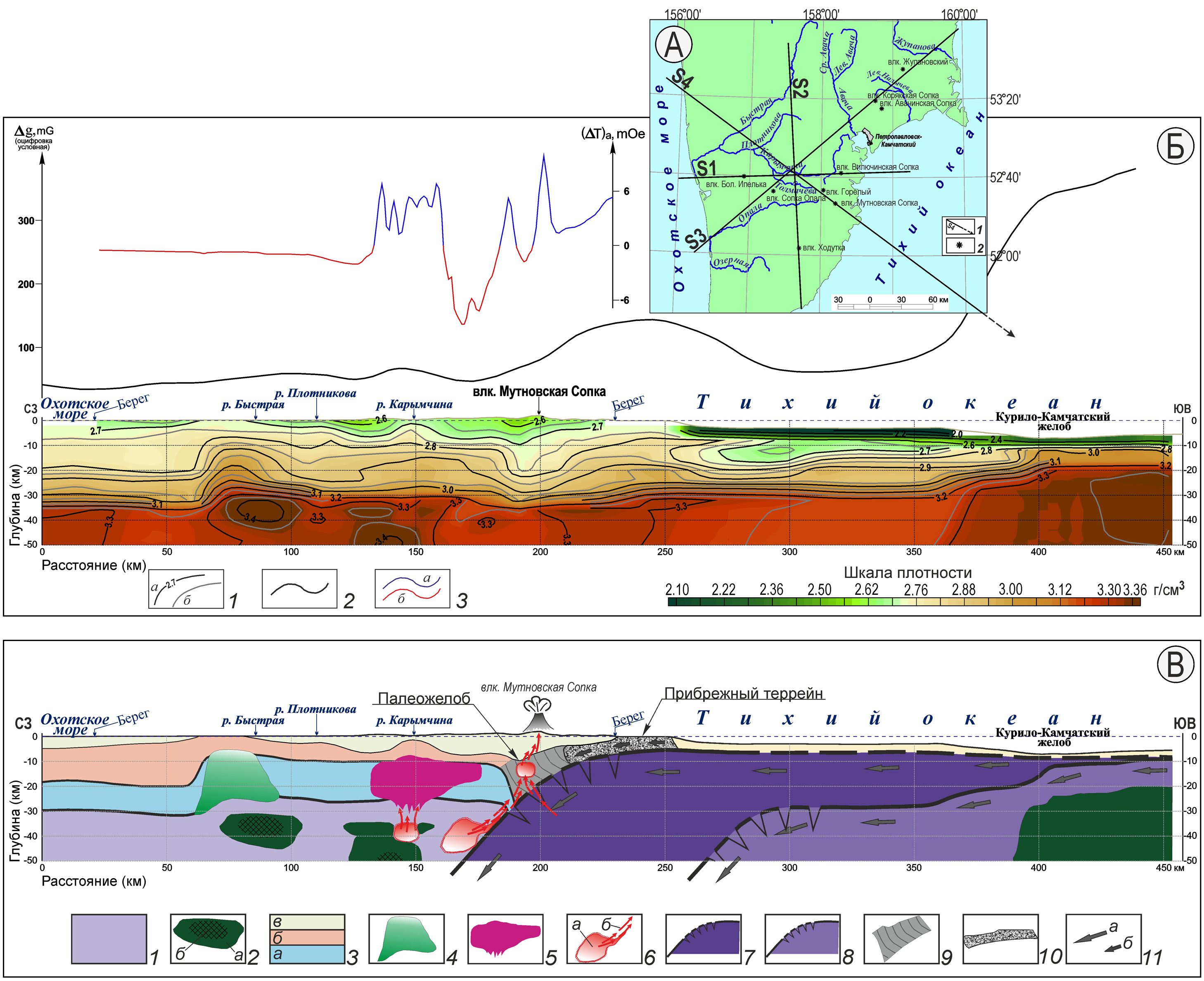 Рис. 6. Плотностной разрез (Б) объёмной модели (рис. 4) (Нурмухамедов, Сидоров, 2022) и схематическая геолого-геофизическая модель (В) взаимодействия литосферных плит вдоль линии S4 (А). Подписи к рис. 6. Рис. 6А: 1 – линии плотностных разрезов и их номера; 2 – вулканы. Рис. 6Б: 1 – изоденсы основные (а), промежуточные (б) и значения плотности в г/см³ (сечение основных изоденсов 0,1 г/см³, промежуточных – 0,05 г/см³); 2–3 графики геофизических аномалий: 2 – в редукции Буге (уровень условный), 3 – магнитного поля (а – положительный, б – отрицательный). Рис. 6В: Континентальная (нависающая) литосферная плита: 1 – верхняя мантия; 2 – зоны развития пород ультраосновного состава с аномально высокой плотностью (≥ 3,3–3,35 г/см³) (а) и в них участки эклогитизации перидотитов (≥ 3,4 г/см³) (б); 3 – слои земной коры: гранулито-базитовый (а), гранито-метаморфический (б), мезокайнозойский вулканогенно-осадочный комплекс пород (в); 4 – блок земной коры, насыщенный интрузиями от ультраосновного до основного состава; 5 – интрузивный массив диорит-гранодиоритового состава (Нурмухамедов и др., 2020; Нурмухамедов, Сидоров, 2022); 6 – предполагаемые очаги плавления, выделенные по данным МТЗ (Нурмухамедов, Сидоров, 2023) и подтверждённые плотностным моделированием (Нурмухамедов, Сидоров, 2022) (а), направление движения магматических расплавов и тепловых потоков (б); 7 – фрагмент палеосубдукции (субдукция до эоцена включительно) с зоной растяжения на участке максимального перегиба слэба; 8 – фрагмент современной субдукции с зоной растяжения; 9 – зона аккреции; 10 – Прибрежный террейн; 11 – направление движения субдукций (а) и островодужного блока (б) в процессе его причленения к краевой части материковой литосферы.