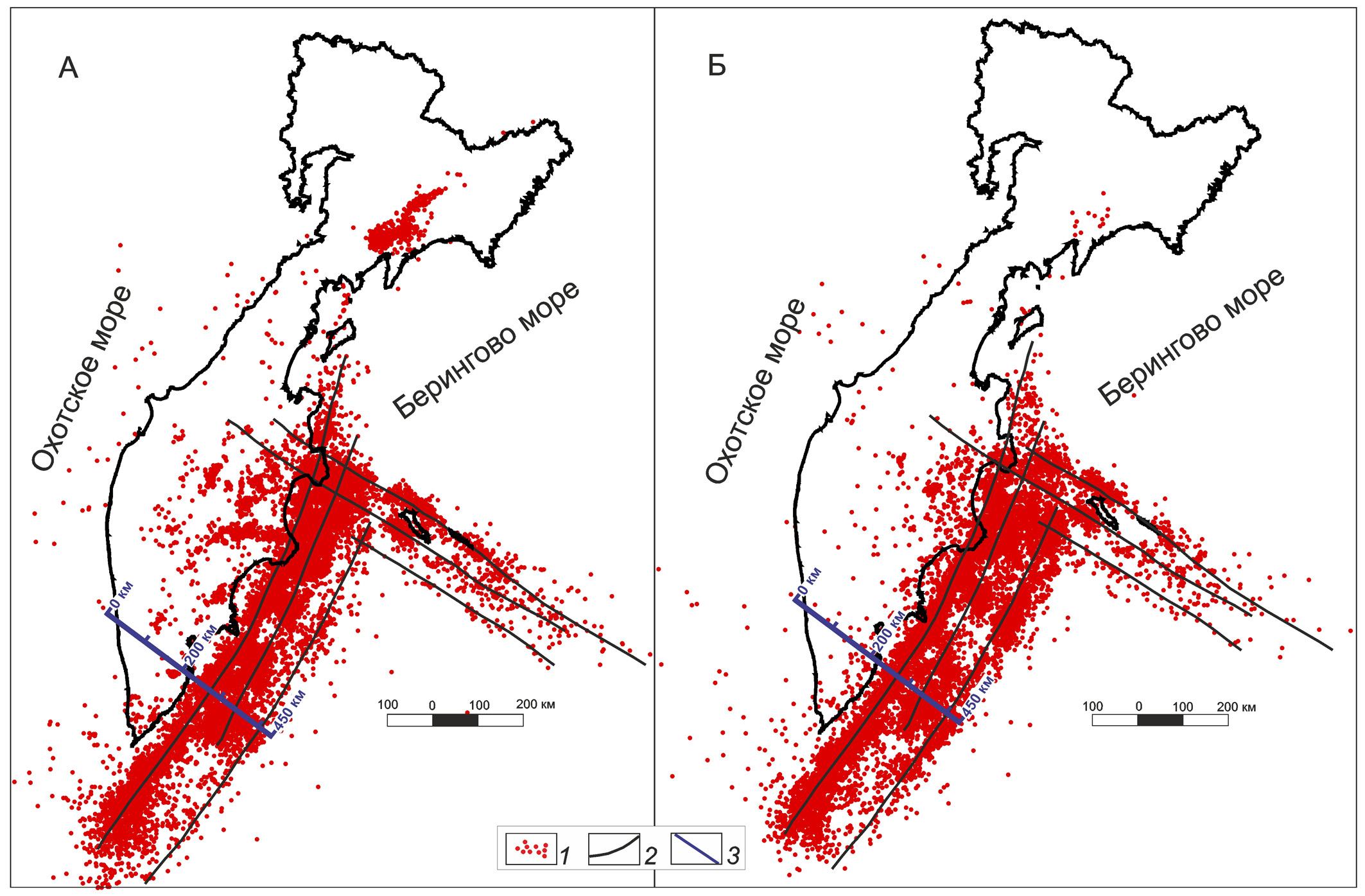 На рис. 7 показаны эпицентры землетрясений с магнитудой М ≥ 3,5 в интервале глубин 0–30 и 30–50 км за период инструментальных наблюдений с 1962 по 2013 гг. (Нурмухамедов, 2013). Данные взяты из каталога землетрясений (http://www.emsd.ru/ts/). Большинство эпицентров расположено к востоку от побережья Камчатки в акватории океана в виде трёх протяженных полос – сейсмических линеаментов, параллельных восточному побережью полуострова. В каждом линеаменте можно провести линию, которая будет маркировать центральную (осевую) часть сейсмически активной области. Сопоставление сейсмических данных с геолого-геофизической моделью (рис. 6) указывает на совпадение зоны максимального перегиба слэба современной субдукции (280–310 км линии) с осевой частью сейсмического линеамента, расположенного наиболее близко к береговой линии. Вероятно, образование тектонического напряжения и её разгрузки в виде землетрясений происходят в процессе продвижения океанической литосферы через зону максимального перегиба на глубине 30–50 км, где происходит формирование зоны растяжения. Это предположение находит подтверждение (Нурмухамедов, 2013) в распределении эпицентров землетрясений по интервалам глубин гипоцентров (рис. 8). Наиболее высокая плотность сейсмических событий с магнитудой М ≥ 5 наблюдается как раз в интервале глубин 30–50 км.