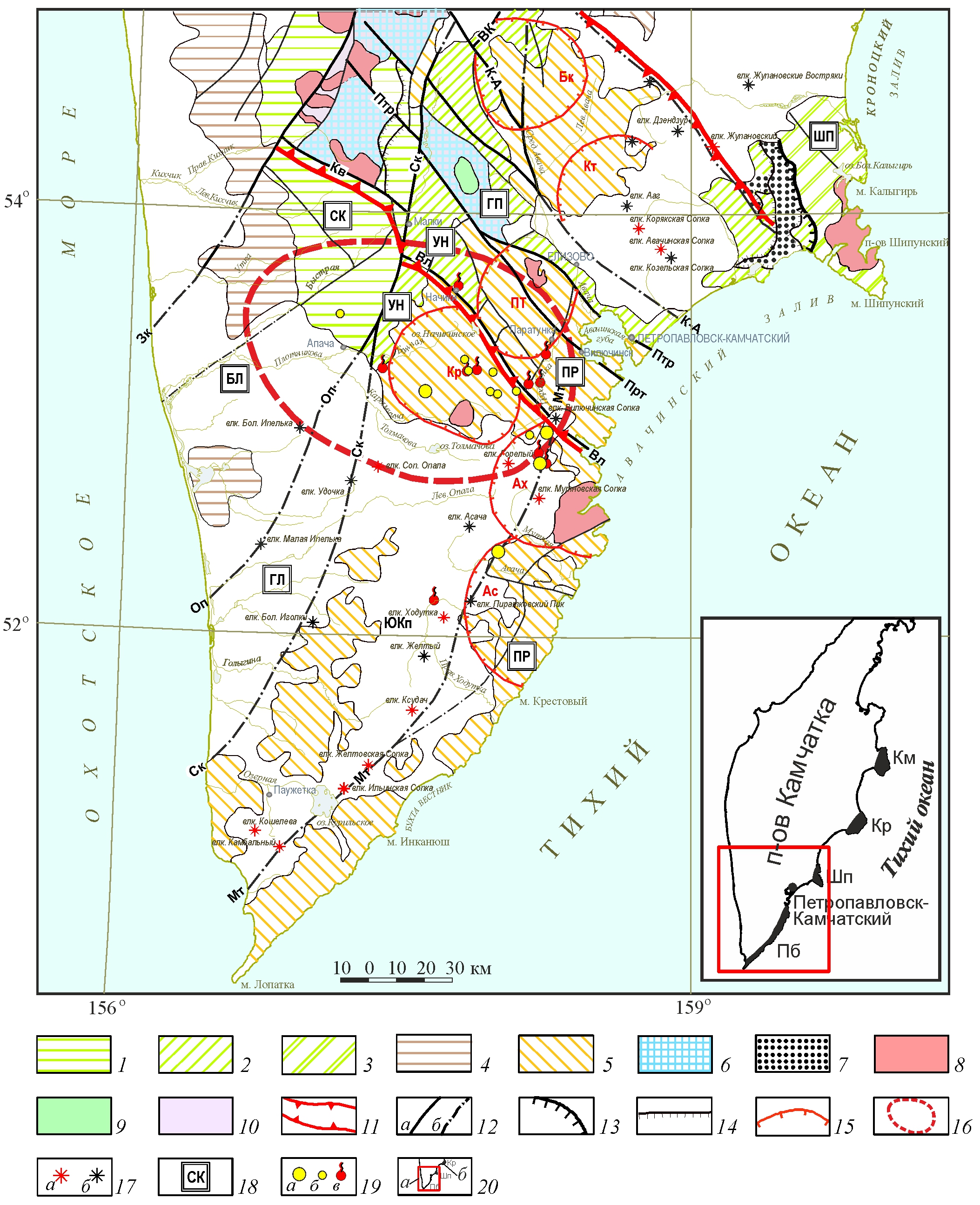 Рис. 2. Фрагмент Тектонической схемы Корякско-Камчатской складчатой области (Нурмухамедов, 2013) – с упрощением и дополнениями. 1 – Корякско-Западно-Камчатская складчатая зона; 2 – Восточно-Камчатская подзона Олюторско-Восточно-Камчатской складчатой зоны; 3 – Приокеанская складчатая зона; 4 – Западно-Камчатский наложенный прогиб; 5 – Курило-Южно-Камчатская островодужная вулканическая зона; 6 – выступы метаморфического основания Корякско-Камчатской складчатой области; 7 – меланж полимиктовый; интрузивные образования: 8 – преимущественно среднего и кислого состава мелового, палеогенового, неогенового возрастов; 9 – основного состава мелового возраста; 10 – метаморфические и кристаллические образования основания складчатых зон; 11 – границы Начикинской зоны поперечной дислокации; 12 – главные разрывные нарушения, выходящие на дневную поверхность (а), перекрытые вышележащими образованиями (б). С-В направления: Зк – Западно-Камчатский, Ск – Срединно-Камчатский, ВК – Восточно-Камчатский, Оп – Опалинский, Мт – Мутновский; С-З направления: К-А – Крутогоровско-Авачинский, Птр – Петропавловский, Прт – Паратунский, Вл – Вилючинский; 13 – надвиг Ватынский; 14 – второстепенные надвиги; 15 – границы вулкано-тектонических структур; 16 – контуры мантийного выступа; 17 – вулканы действующие (а), потухшие (б); 18 – название структур и их обозначение: СК – Срединно-Камчатский горст-антиклинорий, БЛ – Большерецкое поднятие, ГЛ – Голыгинская впадина, УН – Ункановичский горст, ГП – Ганальско-Петропавловский горст, ПР – Прибрежный горст; 19 – месторождения (а) и рудопроявления (б) золота, источники и месторождения термоминеральных вод (в); 20 – контуры площади исследований (а), террейны и их названия (б): Км – Камчаткий, Кр – Кроноцкий, Шп – Шипунский, Пб – Прибрежный.