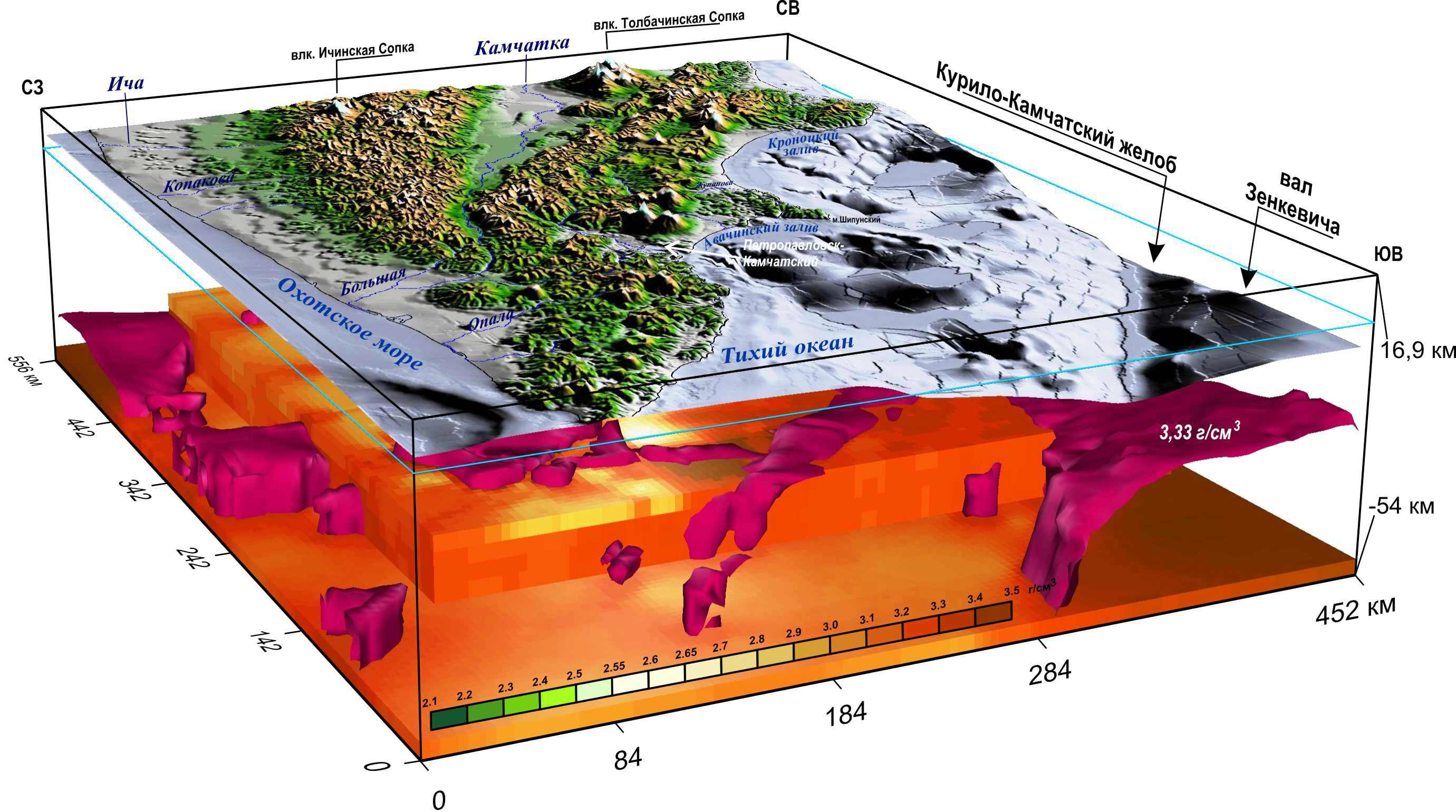 Рис. 4. Блок-диаграмма обзорной плотностной модели земной коры и верхней мантии Южной Камчатки (Нурмухамедов, Сидоров, 2022). На блок-диаграмме вертикальный масштаб увеличен в два раза; часть ячеек «погашена»; рельеф «поднят» на 3 км; истинный уровень моря показан линией голубого цвета; пурпурным цветом показана изоплотностная поверхность слоя с плотностью 3,33 г/см³.