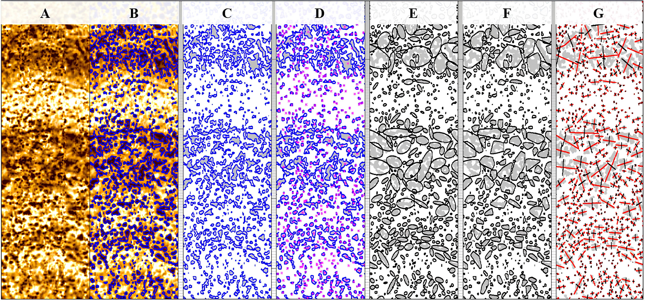 Сегментация глубокой свёрточной сетью дает возможность получить количественную характеристику размеров, форм, ориентаций и топологии объектов (рис. 4 D). С помощью алгоритмов компьютерного зрения (Bradski, 2000) можно оценить изменение форменных параметров по глубине вдоль интервала исследования. К размерам относятся площади, периметры объектов и их выпуклых оболочек. Форма описывается округлостью, удлинением (aspect ratio), выпуклостью (отношение площади объекта к площади выпуклой оболочки) и т.д. К топологическим характеристикам относятся количество объектов и число отверстий в них. Ориентации объекта соответствует угол наклона его наибольшей оси.