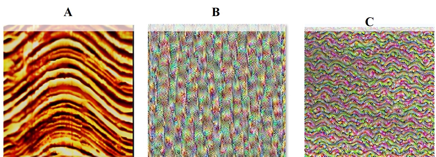 Рис. 10. Пример характерной текстуры и визуализация фильтров, отвечающих за минимальную и максимальную активацию. Обозначения: A – пример текстуры на имидже, B – фильтр, дающий минимальную активацию, C – фильтр, дающий максимальную активацию.