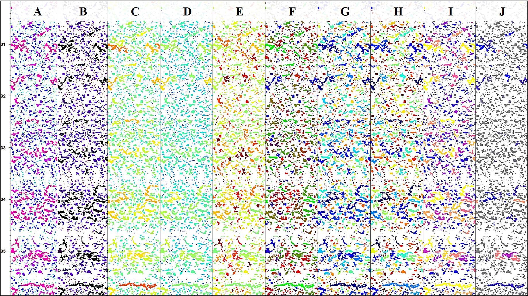 Рис. 7. Закрашивание объектов в соответствии со значениями характеристик. Обозначения: A – площадь, B – периметр, C – длина, D – ширина, E – ориентировка, F – эксцентриситет, G – компактность, H – эллиптичность, I – целостность, J – пустотность.