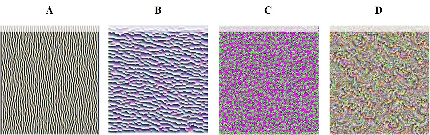 На рис. 10 A показан пример характерной текстуры, а также визуализация методом восходящего градиента двух фильтров, которые давали минимальную (рис. 10 B) и максимальную (рис. 10 C) карту активации (по сумме всех значений).