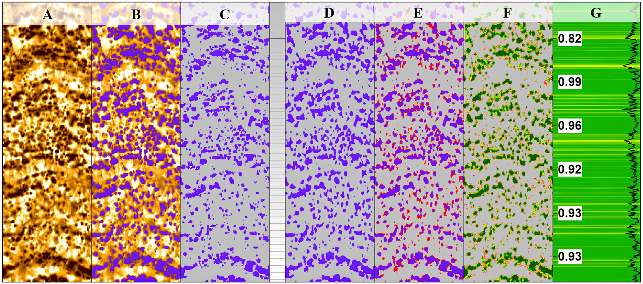 Рис. 4. Пример выделения пятнистой текстуры. Обозначения: A – имидж, B – имидж с наложенной размеченной маской, C – размеченная маска, D – результат сегментации сетью, E – ошибка детекции (разница между размеченными и предсказанными объектами), F – вероятностная карта, G – точность детекции.
