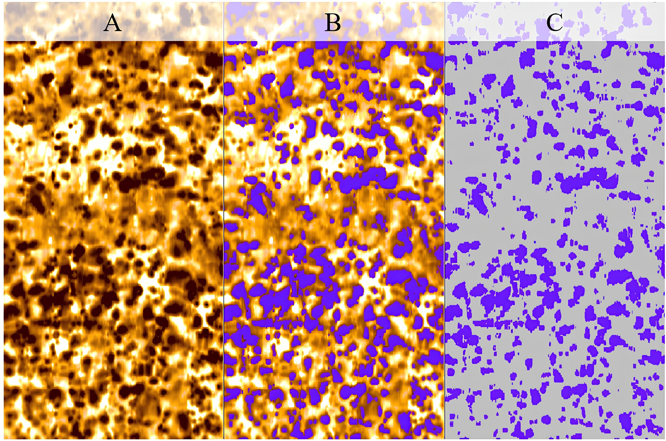 Свёрточная сеть в процессе сегментации основывается на анализе текстурных (например, пятнистости, шероховатости поверхности) и цветовых (например, интенсивности, яркости) характеристик геометрических признаков объектов, их взаимного расположения в пространстве, а также контекстуальных взаимосвязей с окружающими элементами. Такой подход позволяет эффективно выделять и классифицировать различные структуры с учётом их морфологических особенностей и в дальнейшем проводить их количественный и качественный анализ. На рис. 4 представлен пример выделенных объектов. В данном случае сеть обучена для распознавания пятнистых текстур, она адаптирована для выделения этих паттернов и игнорирует другие объекты, например, линейные и вытянутые структуры.
