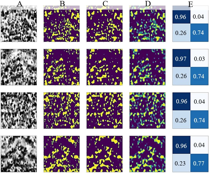 Результат применения настоящей методики к фрагменту изображения микроимиджера из валидационной выборки представлен на рис. 3. Размеченная маска показана на рис. 3 B, предсказанная сетью бинарная маска на рис. 3 C. Была получена вероятностная карта маски (рис. 3 D), на которой пикселям присвоены значения в диапазоне от 0 до 1 – вероятности принадлежности пикселя фону и объекту соответственно. Помимо этого, представлены матрицы ошибок (рис. 3 E), которые показывают долю верно предсказанных масочных и фоновых пикселей, а также долю ложноположительных и ложноотрицательных срабатываний. Значения Acc и IoU на валидационном наборе данных составили 92% и 85% соответственно.