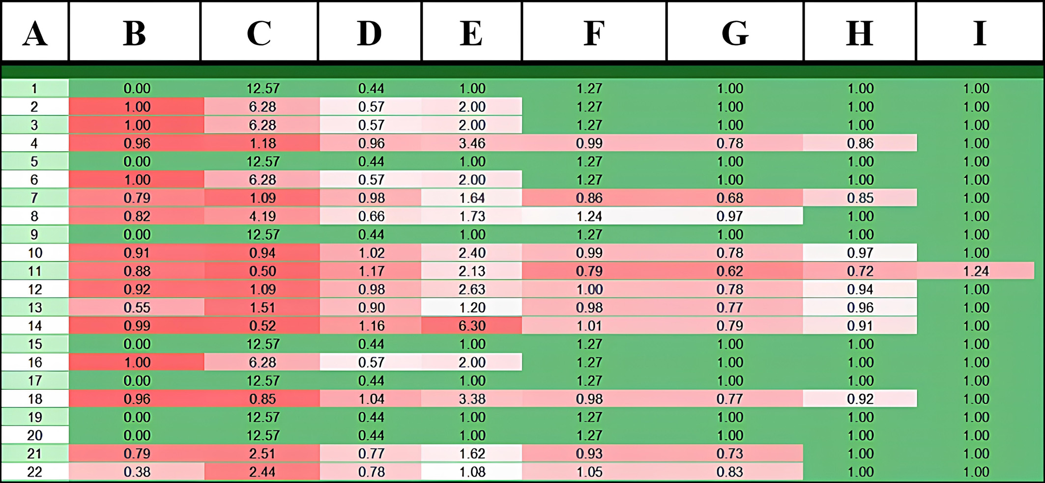 Рис. 5. Табличный формат представления результатов оценки форменных параметров целевого класса объекта. Обозначения: A – номер объекта, B – эксцентриситет, C – компактность, D – округлость, E – удлинение, F – эллиптичность, G – коэффициент прямоугольности, H – целостность, I – извилистость.