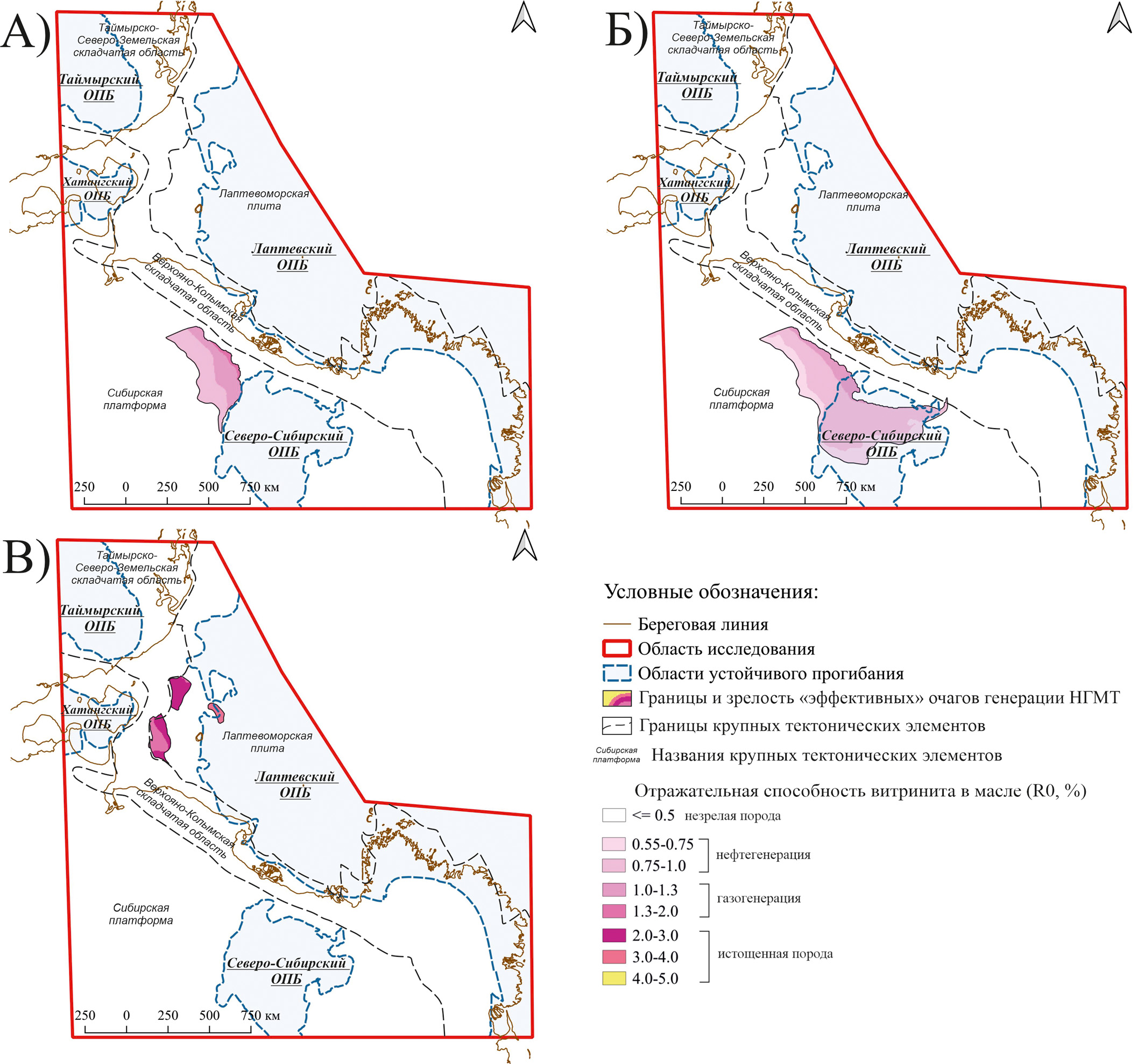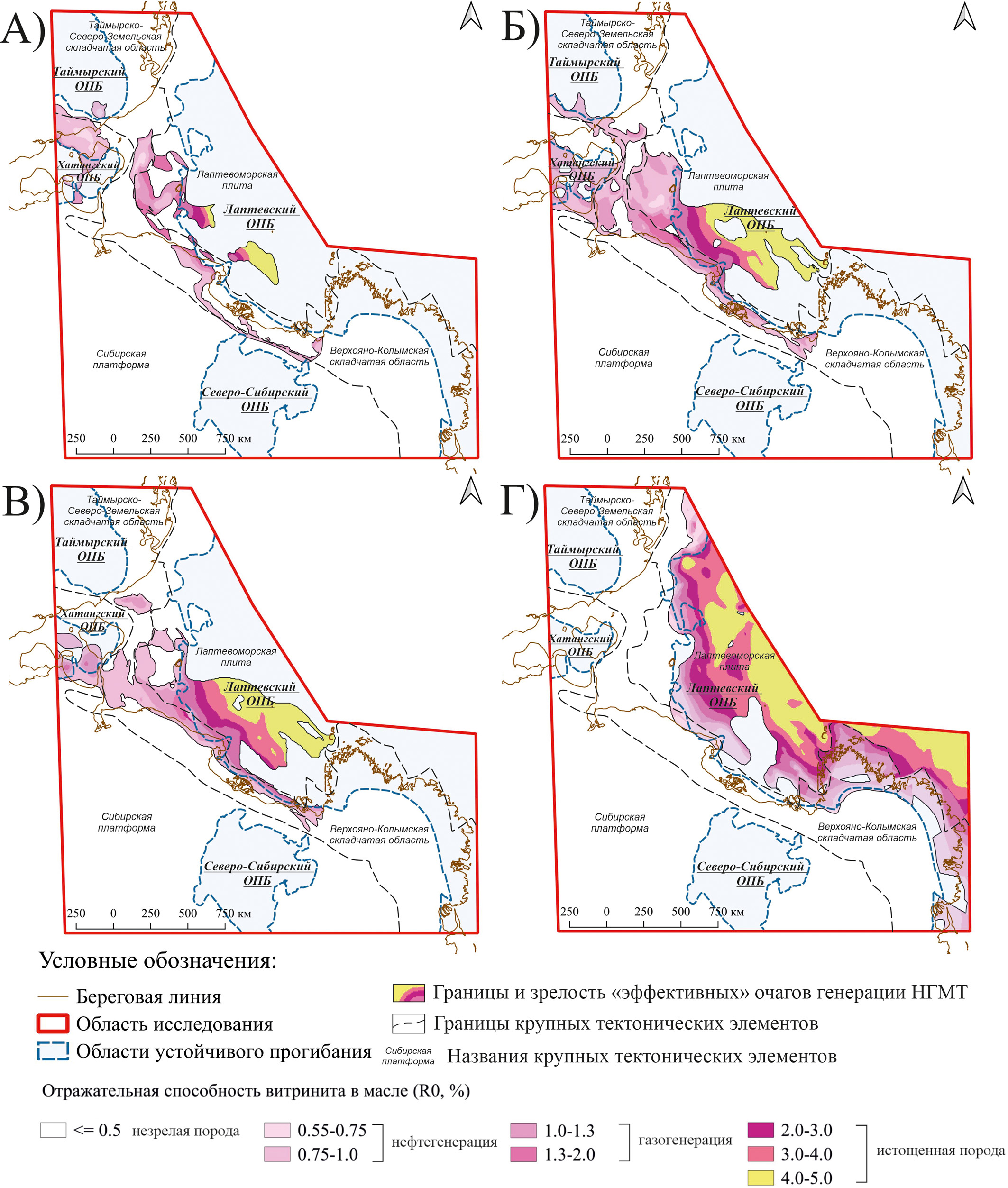 Зрелые и перезрелые породы верхнерифейской НГМТ широко распространены в пределах изучаемого района и охватывают как сушу (погруженную часть Лено-Анабарского прогиба), так и прибрежную зону, включающую Хатангский залив и юго-западную часть моря Лаптевых. Зрелость пород увеличивается с юга на север от стадии МК1 до АК, что хорошо согласуется с оценками Д.С. Лежнина с соавторами, которые на основании данных по глубоким скважинам и результатов геохимических исследований прогнозируют зрелость верхнерифейской НГМТ на территории Лено-Анабарского прогиба на уровне МК2-АК (Лежнин и др., 2021). При этом, на большей части исследуемого района верхнерифейская толща уже исчерпала свой потенциал, а в Лено-Анабарском прогибе процессы нефте- и газогенерации продолжаются (рис. 6 А). Эмиграция УВ в пределах области распространения НГМТ начиналась и заканчивалась в разное время, что обусловлено различиями вертикальных движений на фоне происходивших тектонических событий на изучаемой территории. Так, в Лено-Анабарском прогибе УВ из верхнерифейской НГМТ начали эмигрировать почти сразу же, в конце рифея-начале венда. Конец эмиграции на этой территории приходится на начало неогена. В Анабаро-Хатангской седловине эмиграция УВ началась в конце кембрия. На протяжении пермско-триасового времени объемы эмиграции последовательно нарастали. В конце мела эмиграция завершилась. В акватории моря Лаптевых эмиграция началась в конце рифейского времени, сильно замедлилась к концу триаса и окончательно прекратилась к середине мела.