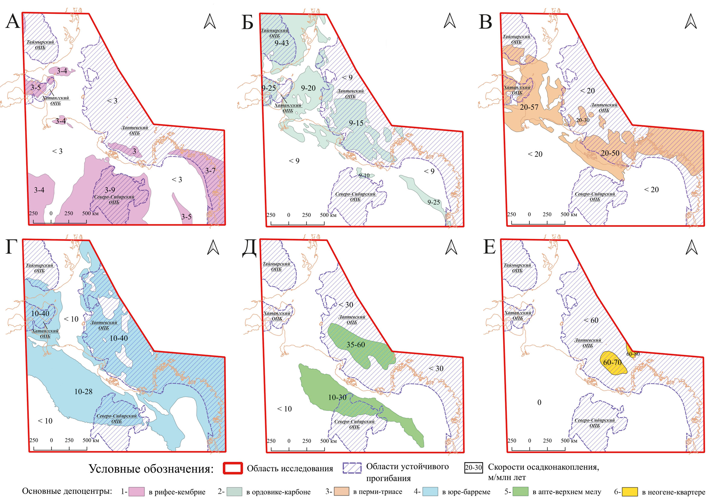 В пределах района исследования на основании анализа карт мощностей выделены 4 ОПБ, включающие разновозрастные депоцентры осадконакопления (Павёлкина и др., 2024).