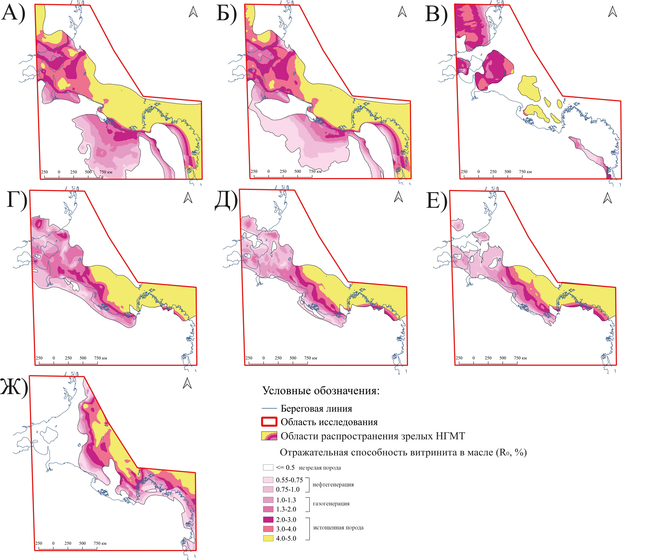 Рис. 6. Карты современной зрелости НГМТ: А) верхнерифейской; Б) вендской; В) девонской; Г) тустахской; Д) нижнекожевниковской; Е) верхнекожевниковской; Ж) верхнеюрской