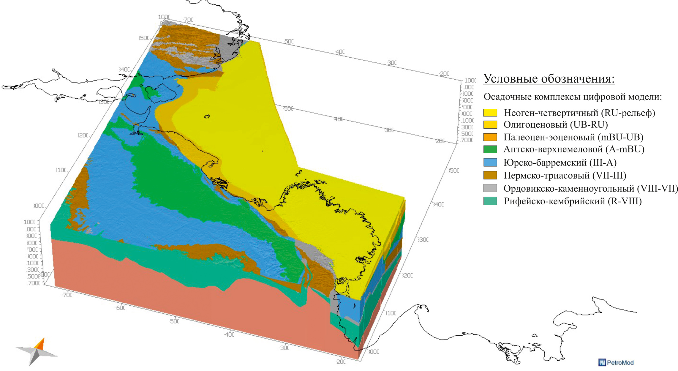 Таким образом, трехмерная цифровая геологическая модель зоны сочленения Сибирской платформы и тектонических структур южной части моря Лаптевых, отражающая ее современное строение, включает поверхность фундамента и 8 осадочных комплексов: рифейско-кембрийский (R-VIII), ордовикско-каменноугольный (VIII-VII), пермско-триасовый (VII-III), юрско-барремский (III-A), аптско-верхнемеловой (A-mBU), палеоцен-эоценовый (mBU-UB), олигоценовый (UB-RU), неоген-четвертичный (RU-рельеф). С целью изучения влияния тектонических движений на формирование осадочных комплексов использовалась стандартная методика бэкстрипинга (англ. «back stripping»), являющаяся частью численного моделирования бассейнов и предусматривающая последовательное исключение нагрузки вышележащих слоев пород (включая, при необходимости, размытые мощности отложений), соответствующее разуплотнение нижележащих слоев с выравниванием поверхности на палеорельеф. Количество временных шагов бэкстрипинга соответствует количеству слоев в модели. Результатом является серия трехмерных моделей, отражающих основные этапы тектонической эволюции объекта исследования – так называемая «пространственно-временная» модель. Пространственно-временная модель рассчитывалась с шагом 1х1 км. Время начала и окончания периодов осадконакопления отложений определялось в соответствии с Общей стратиграфической (геохронологической) шкалой по состоянию на 2022 г. (Павёлкина и др., 2024) (рис. 3).