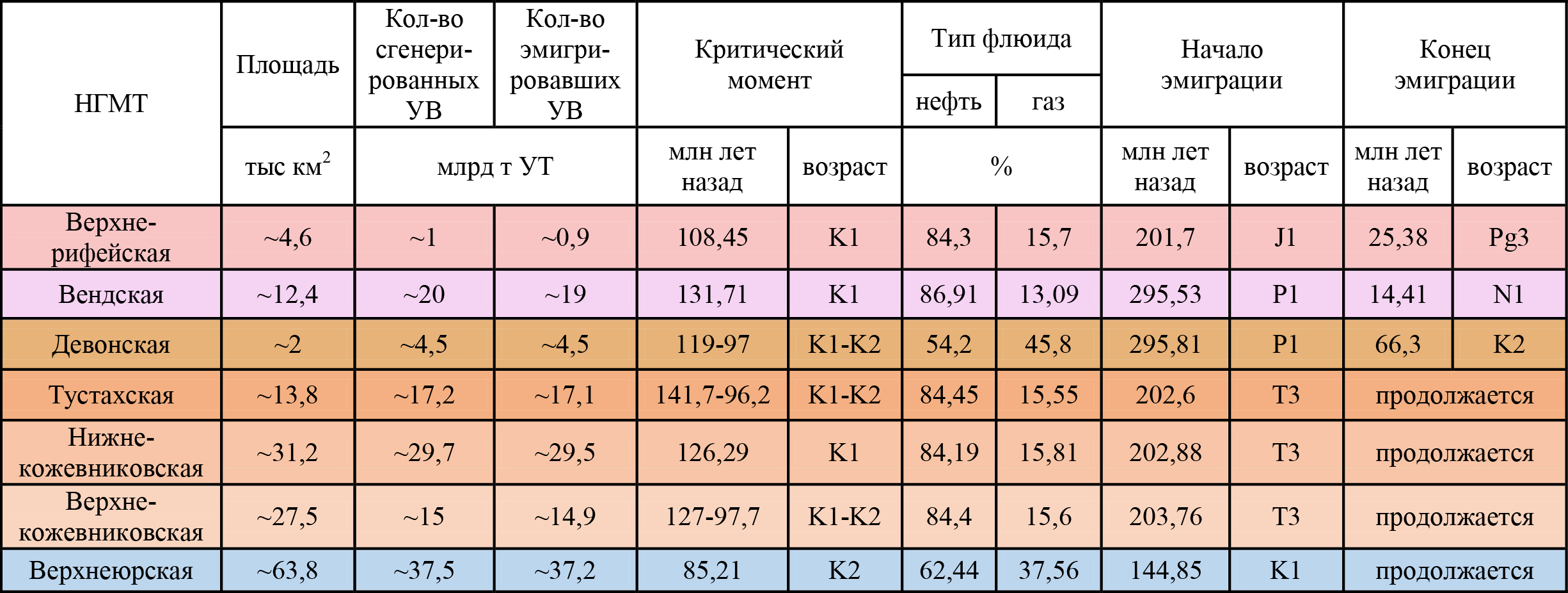Генерационные и эмиграционные характеристики разновозрастных НГМТ оценивались в пределах оконтуренных «эффективных» очагов нефтегазогенерации.