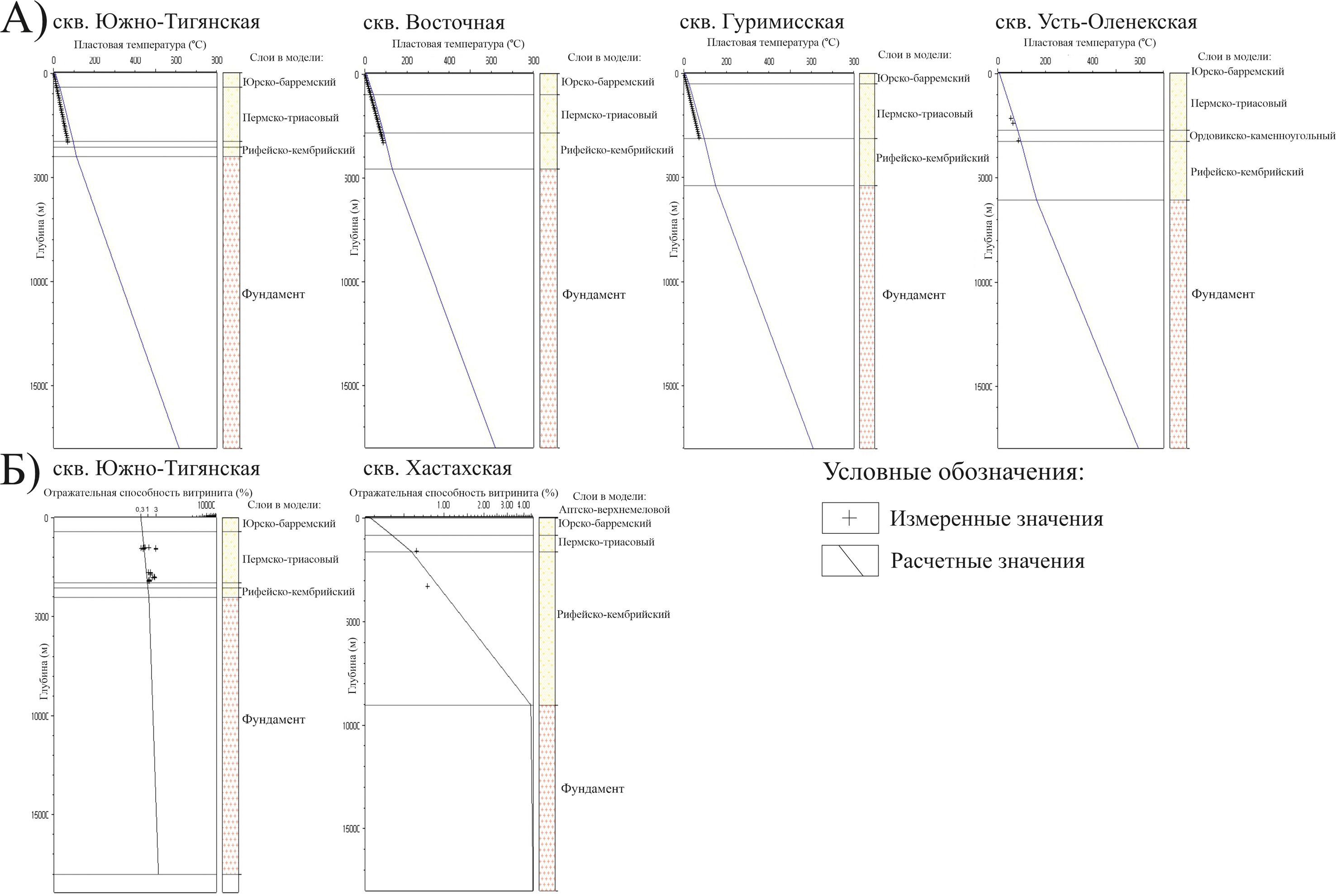 В целях оценки надежности полученных результатов моделирования выполнена верификация модели эволюции теплового режима бассейнов с использованием пластовых температур (Тпл) и отражательной способности витринита (R0) (Конторович, Фомин, 2014; Дучков и др., 2023; Черных, 2018). Результаты верификации модели в части тепловой истории показали удовлетворительную сходимость расчетных и калибровочных данных, что позволило использовать ее в качестве основы для решения поставленных задач в рамках выделения и изучения очагов нефтегазогенерации (рис. 5).