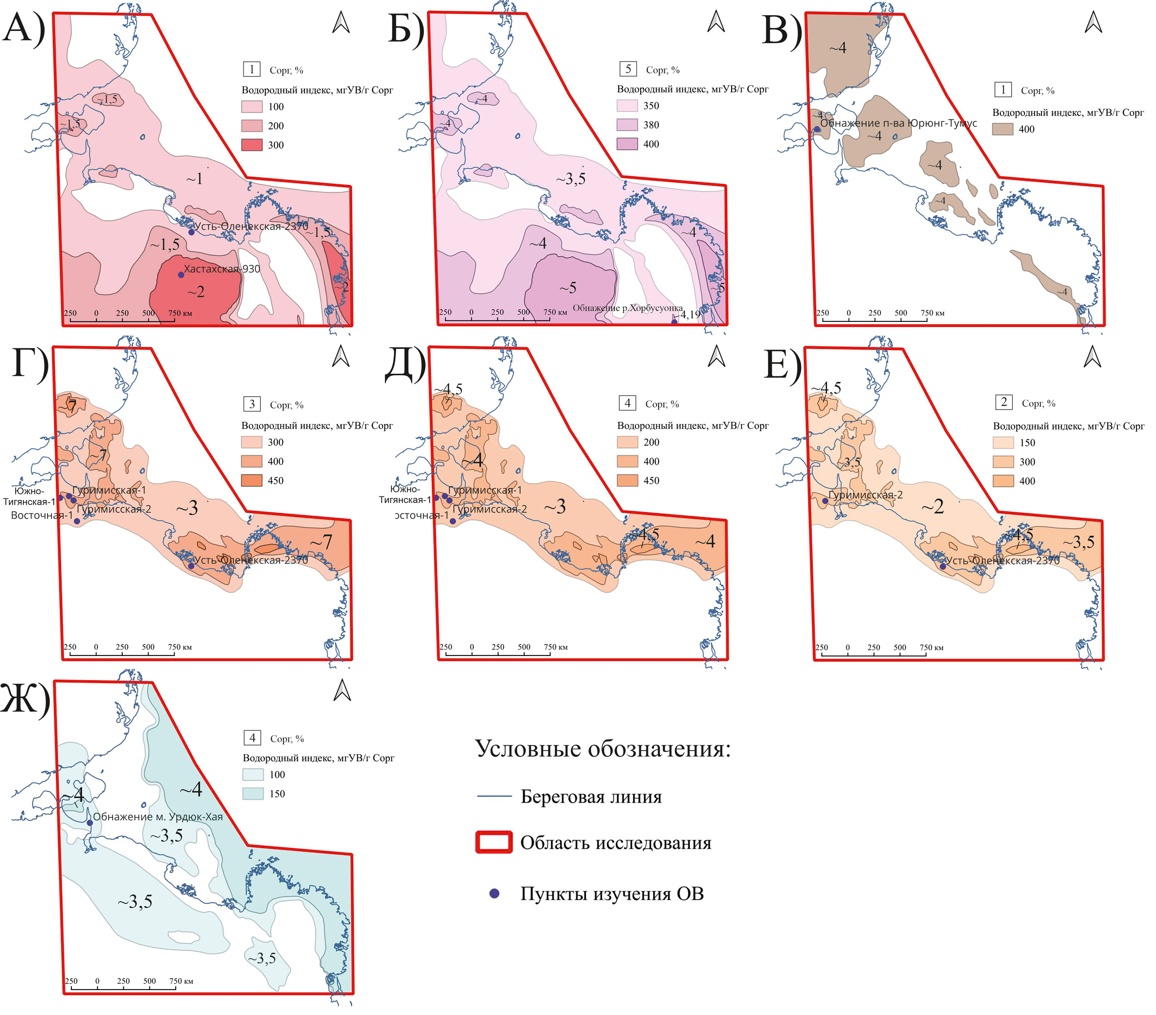 Для изучения очагов нефтегазогенерации, на основании собранной базы данных геохимических характеристик и проведенных палеогеографических реконструкций (Павёлкина и др., 2024), построены схемы распределения нефтегазоматеринских свойств верхнерифейской, вендской, девонской, пермских (в составе тустахской, нижнекожевниковской и верхнекожевниковской свит) и верхнеюрской НГМТ. При построении схем, результаты изучения геохимических характеристик в контрольных точках (скважинах, обнажениях) экстраполировались на всю палеогеографическую зону, к которой эти точки принадлежат, исходя из соображений, что в одинаковых условиях осадконакопления могли формироваться нефтегазоматеринские породы сходного состава. В случае отсутствия контрольных точек для характеристики НГМТ применяли принцип экстраполяции, предполагая «улучшение» геохимических свойств в дистальных зонах палеобассейна и ухудшение – в проксимальных (Павёлкина и др., 2024).
