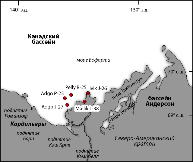 Ресурсная оценка газогидратов в пределах БМБ (рис. 3) основана на данных каротажа 203 скважин на суше и в прибрежной зоне на основе детерминированного и вероятностного моделирования (Osadetz, Chen, 2010). На основе материалов ГИС скважин проанализированы данные по газогидратоносным интервалам, и оценена гидратонасыщенность отложений. Из исследованных 203 скважин только 122 скважины вскрыли газовые гидраты. В работе (Osadetz, Chen, 2010) применялся метод «Арчи» для расчета гидратонасыщенности на основе данных гамма-каротажа; карта плотности структурных элементов, учитывающая разломы и складчатые зоны, способствующие миграции углеводородов, использована, чтобы оценить миграцию УВ газов.