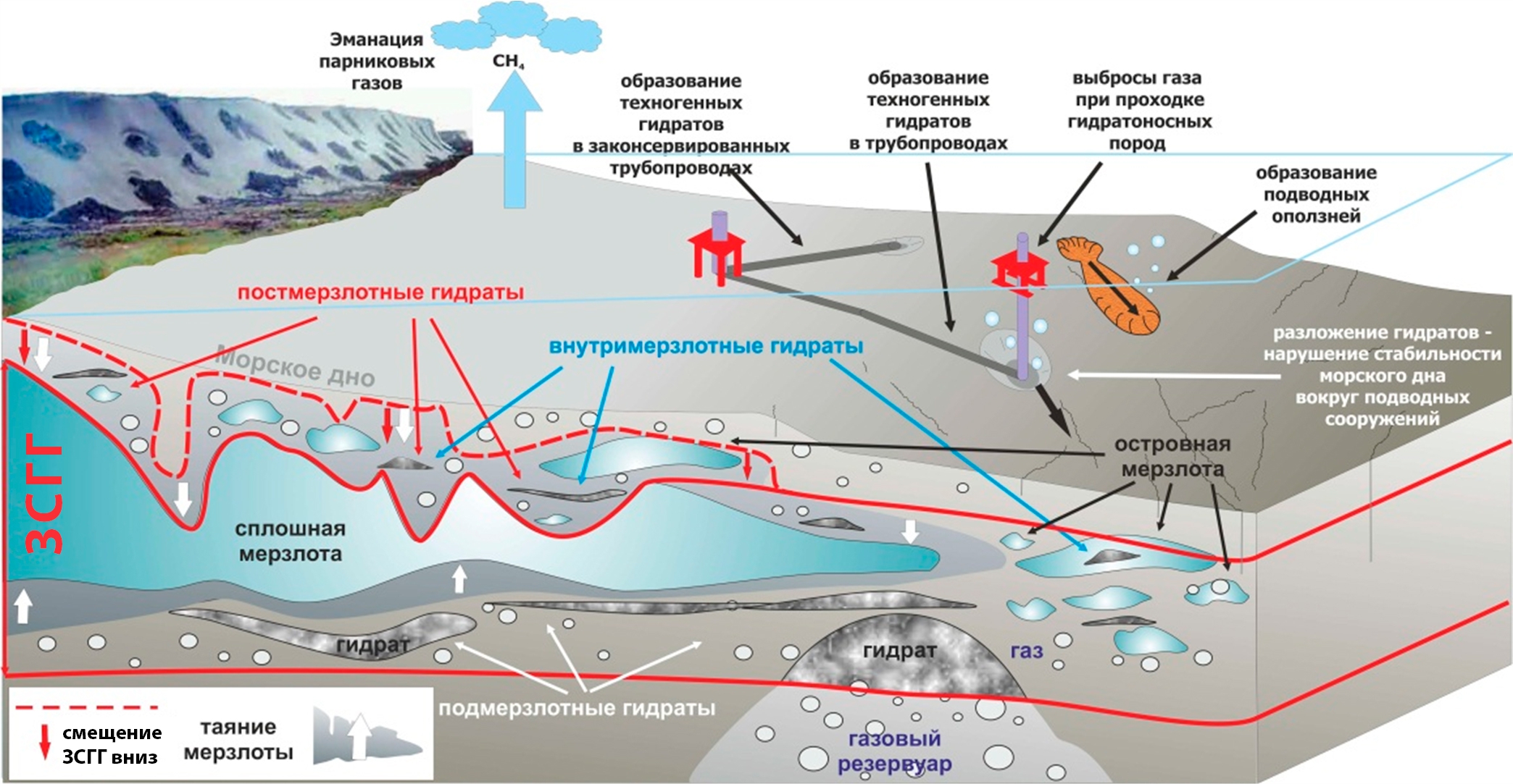 Рис. 1. Различные генетические типы криогенетических гидратов в акваториях арктических морей и опасности, связанные с наличием гидратов в субаквальных отложениях по (Матвеева, Логвина, 2011)