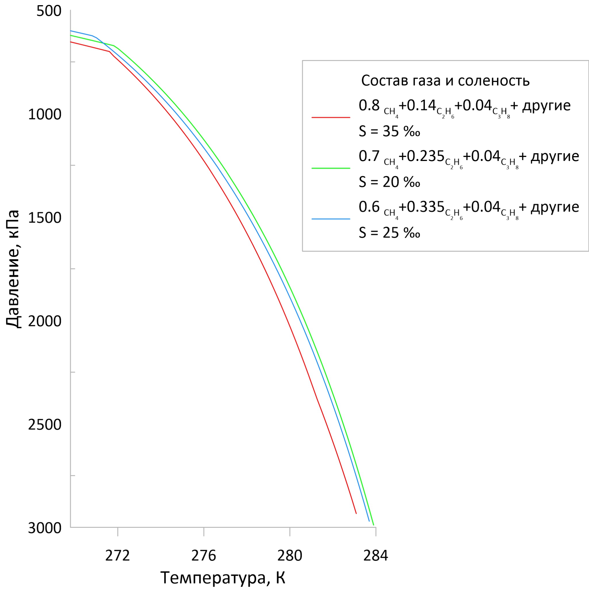 Пример вычисленных кривых с различным составом газа-гидратообразователя представлен на рисунке 5, из которого видно, что наименее благоприятные условия для формирования ЗСГГ соответствуют повышению доли метана в составе газовой смеси, а также повышению солености гидратообразующей воды.