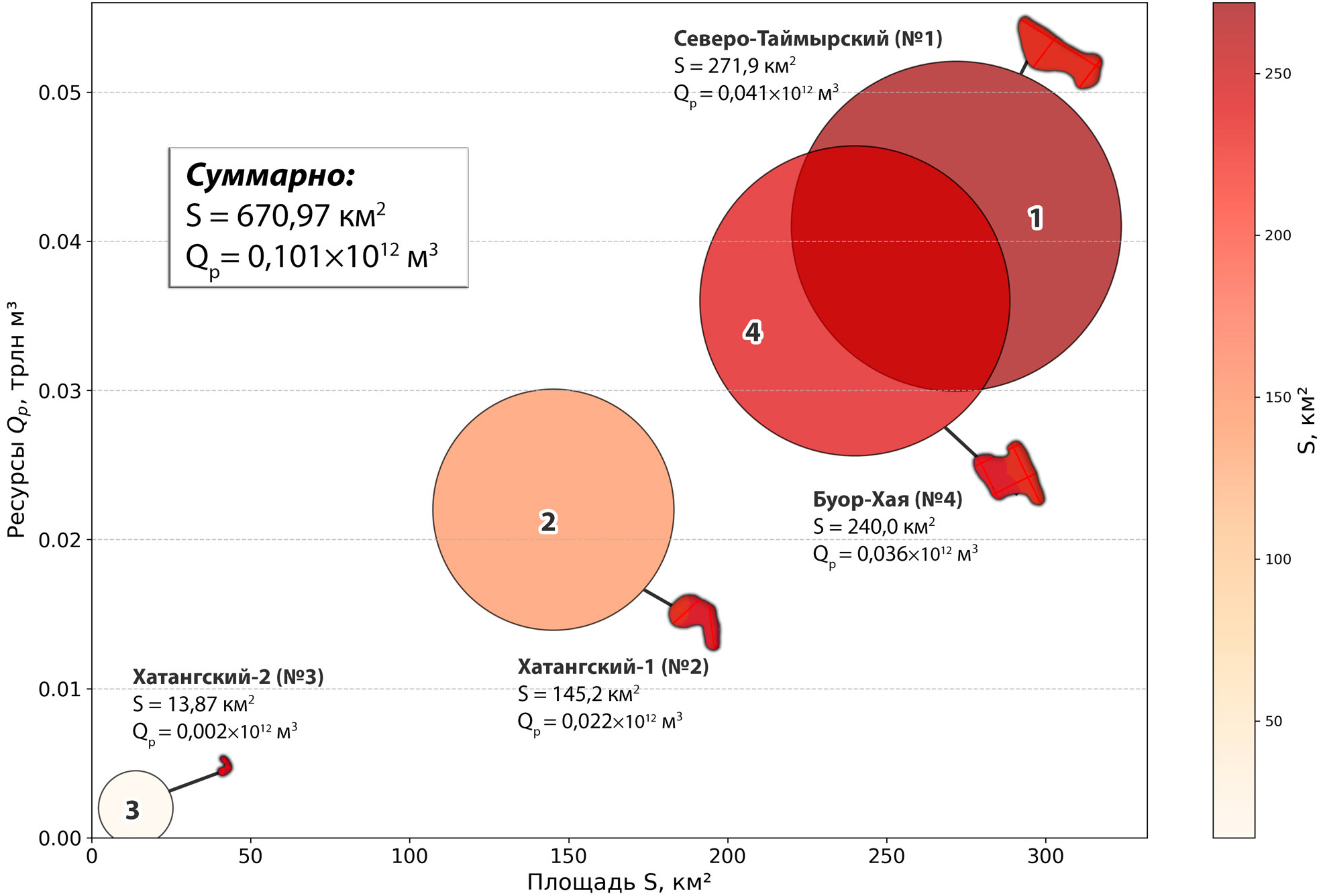 где Si – площадь соответствующего нефтегазогеологического таксона, qi – удельное содержание газа на единицу площади соответствующего данному таксону диапазона, получив тем самым общее содержание газа (Qi) в газовых гидратах соответствующей i-ой пространственной единицы.