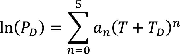 где PD – равновесное давление (мПа), T и TD – равновесная температура и ее отклонение за счет солености среды соответственно, an – эмпирические константы.