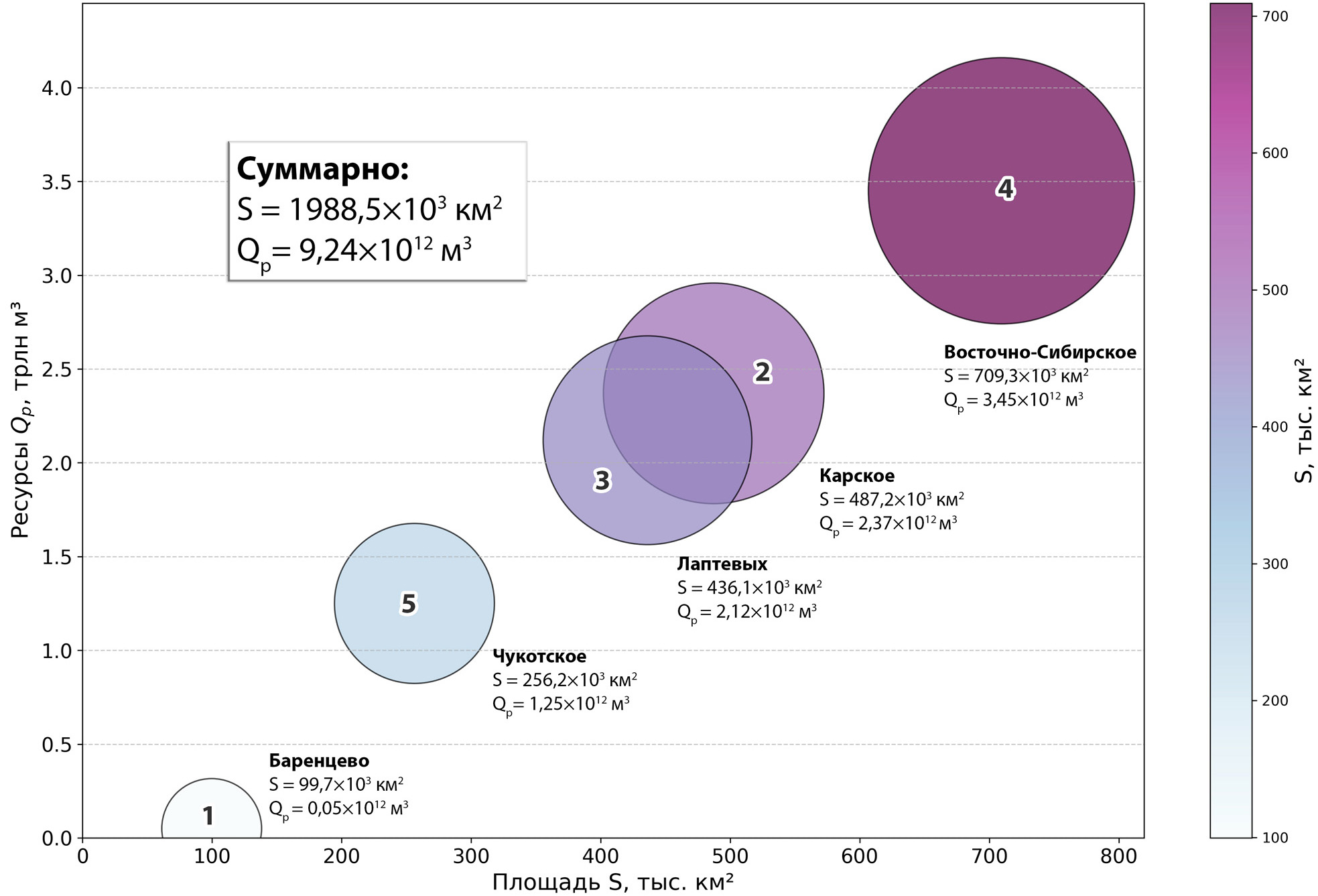 Полученные региональные оценки (Qр) находятся в прямой зависимости от площади потенциально газогидратоносных провинций, что обусловлено методикой расчета при постоянной удельной плотности ресурсов (рис. 11). Так, наибольшим Qр характеризуется Восточно-Сибирское море (3,45 трлн м³), следом за которым с большим отрывом следует Карское море (2,37 трлн м³).