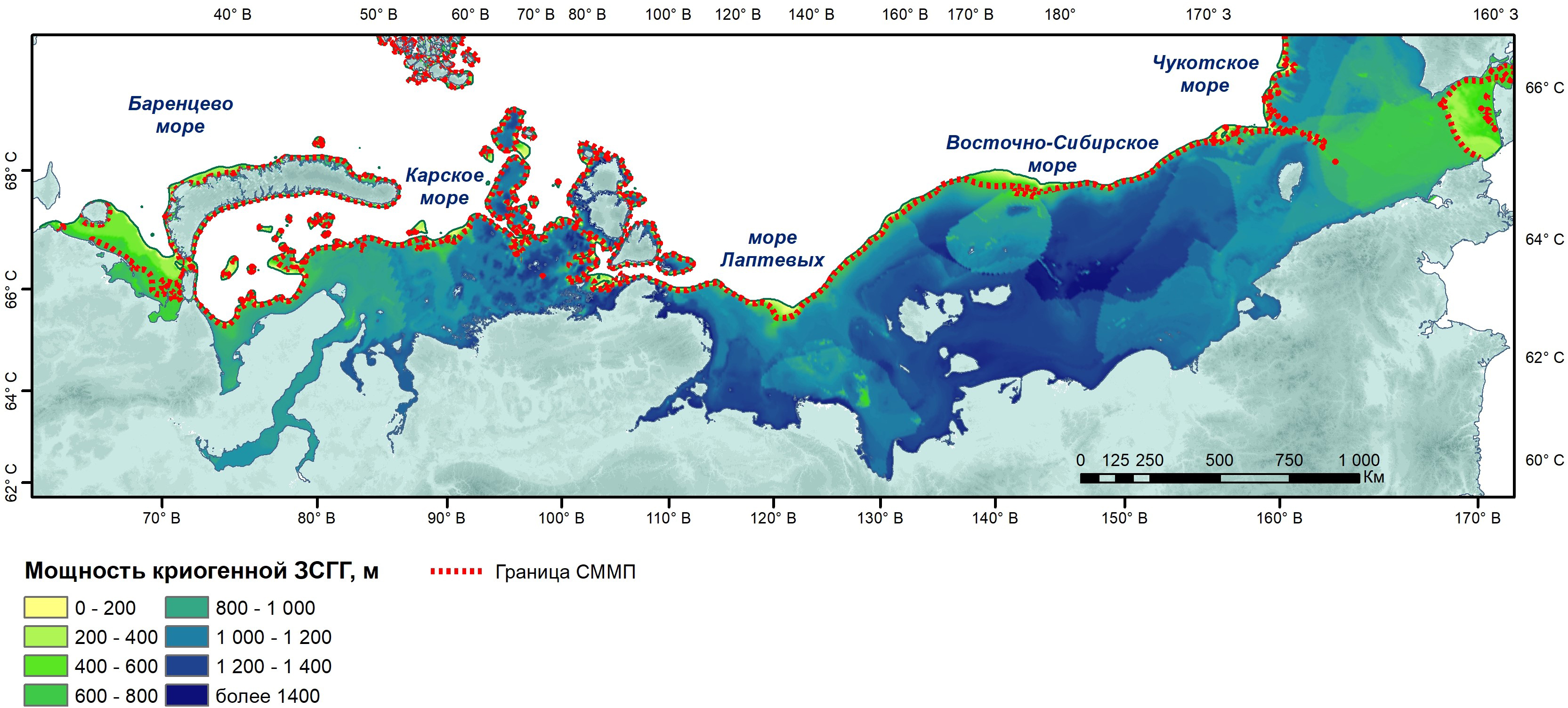 По данным численного моделирования наибольшие мощности ЗСГГ криогенного типа прогнозируются в морях Лаптевых и Восточно-Сибирском, наименьшие – в Печорском и Чукотском. Сопоставление площадей ЗСГГ и криолитозоны показывает наличие участков, где в настоящий момент криолитозона полностью деградировала, но, вследствие высокой инерционности морских отложений как системы, возможно формирование «посткриогенной» (постмерзлотной) ЗСГГ, учтенной в ресурсных оценках.