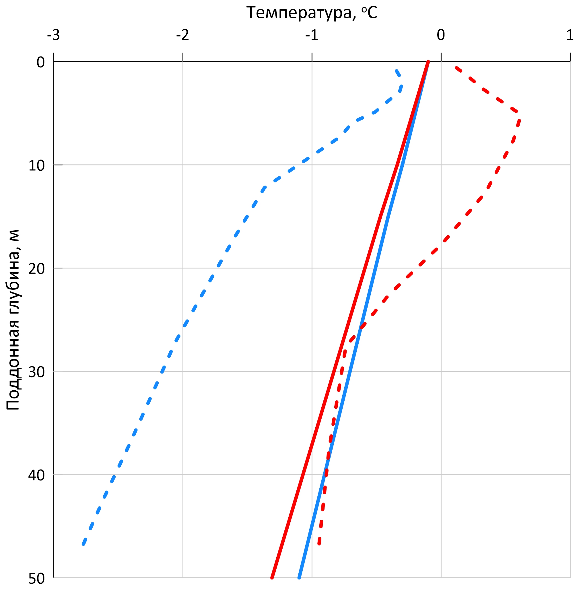 Рис. 4. Результаты моделирования (Смирнов и др., 2024) и данные термометрии из скважин залива Буор-Хая (Chuvilin et al., 2021). Красный цвет – скважина 4D-12, синий – скважина 1D-14, сплошные линии – результаты моделирования, пунктир – данные термометрии.