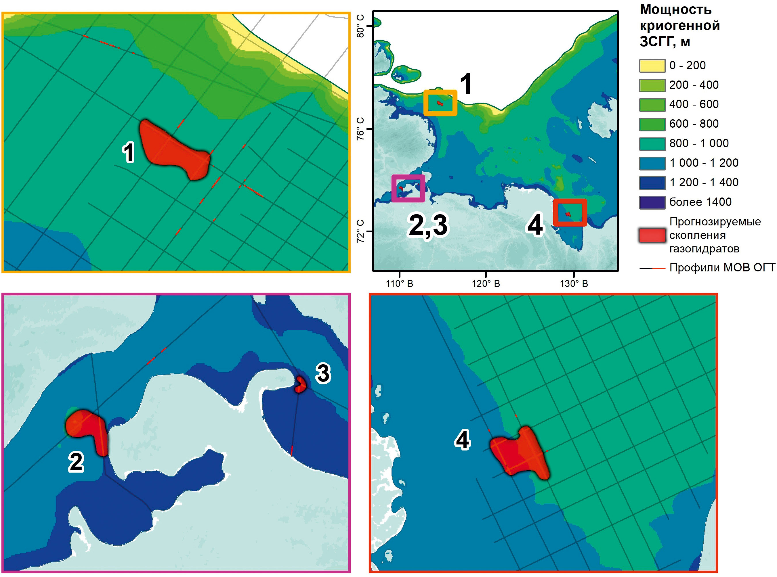 Рис. 8. Прогнозируемые газогидратоносные объекты (подмерзлотные скопления) в шельфовой зоне моря Лаптевых: 1 – «Северо-Таймырский-1», 2 – «Хатангский-1», 3 – «Хатангский-2», 4 – «Буор-Хая-1»