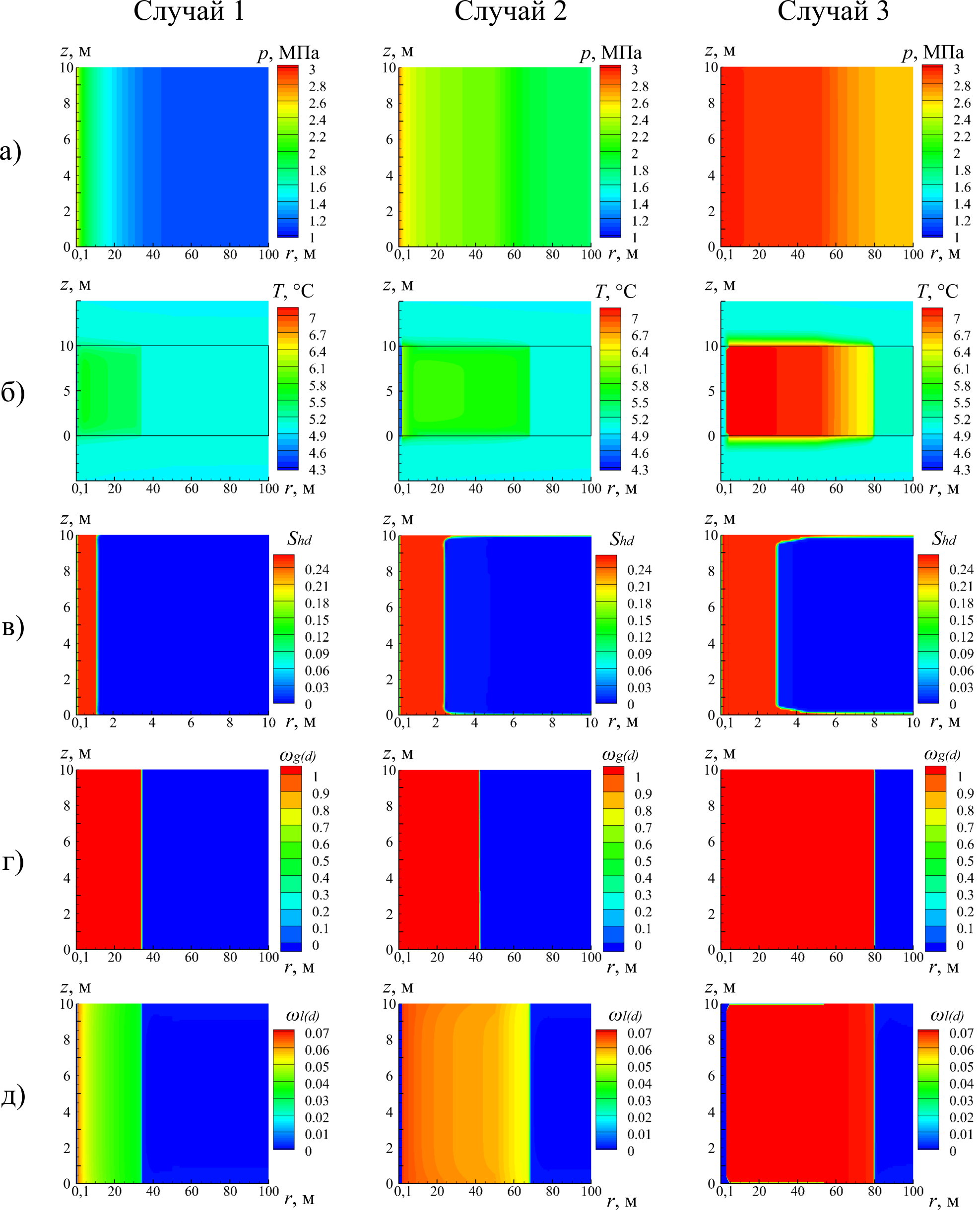 На рис. 2 представлены поля давления, температуры, насыщенности гидратом CO2, массовой доли CO2 в газовой смеси и массовой доли растворенного CO2 в воде для трех случаев (рис. 1).
