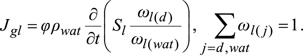 Здесь и далее индексы j = sk, g, l, h, d, m и wat относятся к параметрам скелета пористой среды, газовой фазы, жидкой фазы, газового гидрата, диоксида углерода, метана и воды, соответственно; нижние индексы в скобках означают составляющие соответствующей фазы. Jgl – интенсивность растворения CO2 в воде, кг/(м³·с); Sj ( j = g, l, h) – насыщенность пор j-ой фазой; φ – пористость пласта; ρwat – плотность воды, кг/м³; ωl(d) и ωl(wat) – массовое содержание диоксида углерода и воды в жидкой фазе, соответственно.
