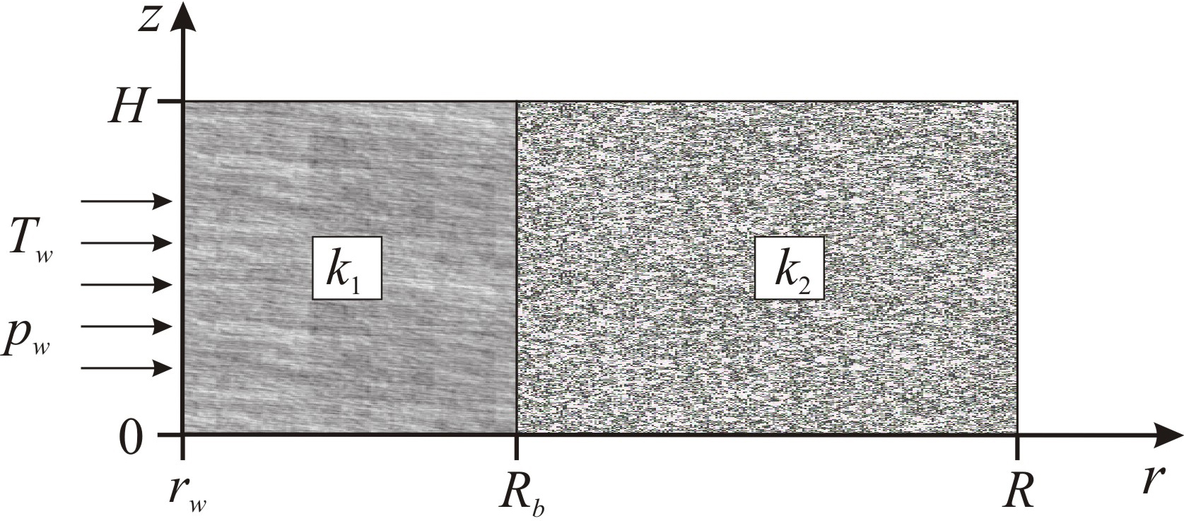 Пусть закачка газа осуществляется через скважину радиуса rw, которая вскрывает пласт на всю его высоту. Внешние границы пласта являются непроницаемыми для вещества, однако через них может происходить теплообмен с окружающими породами за счет теплопроводности. Пусть рассматриваемая сплошная среда в исходном состоянии состоит из трех фаз: из твердого каркаса (скелета), не участвующего в физико-химических превращениях, метана и воды с известной насыщенностью. Скелет пористой среды полагаем неподвижным и несжимаемым. Примем, что в начальный момент времени температура в рассматриваемом пласте и окружающих его горных породах равна T0. Фильтрация возможна только в пористом пласте, исходное давление в нем p0. Рассматриваемый пласт состоит из двух зон с различной проницаемостью k1 и k2. Пусть нагнетание диоксида углерода осуществляется при постоянном давлении pw, при этом температура на забое скважины Tw имеет постоянное значение, меньшее равновесной температуры образования гидрата CO2 для давления pw (рис. 1).