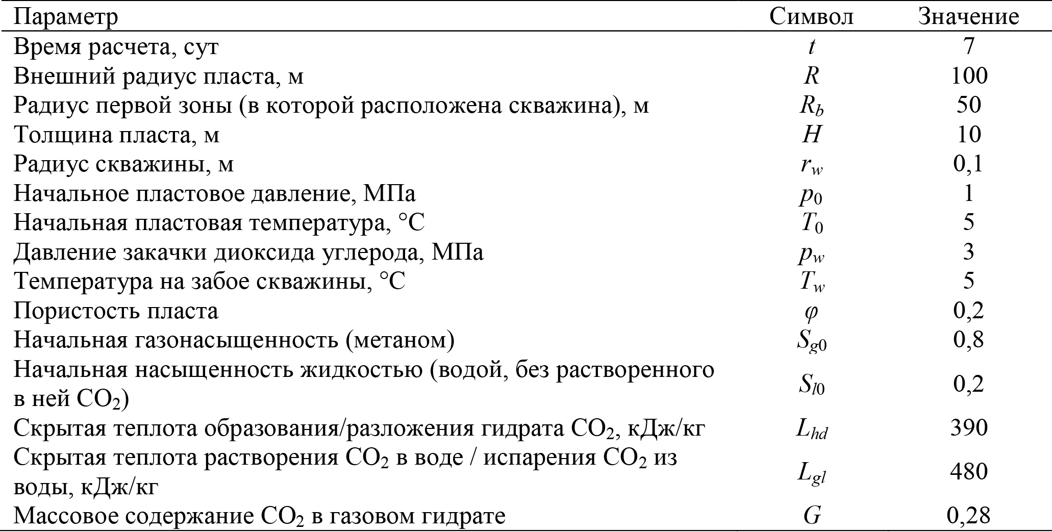 Следующим шагом исследования процесса хранения диоксида углерода в геологических формациях в твердой газогидратной форме стало проведение вычислительных экспериментов по изучению особенностей образования гидрата CO2 при закачке диоксида углерода в пласт, в исходном состоянии насыщенный водометановой смесью. Эти расчеты производились на основе авторского компьютерного кода, численно реализующую математическую модель. Методика расчета параметров изучаемого процесса представлена авторами на Первой Российской газогидратной конференции «Газовые гидраты – энергия будущего» (Бородин, Мусакаев, 2024), и она аналогична методике, изложенной в работе (Musakaev et al., 2020). Значения параметров, используемые при проведении расчетов (если не указано дополнительно), приведены в табл. 1 (Истомин, Якушев, 1992; Бородин, Бельских, 2020; Misyura et al., 2023).