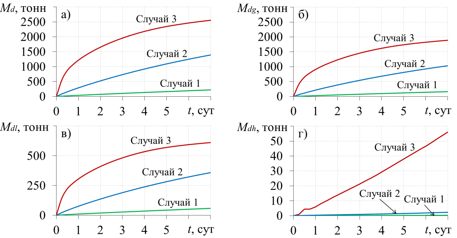 Рис. 4. Динамика изменения накопленной массы диоксида углерода в пласте: а) суммарная масса; б) в газообразном состоянии; в) в растворенном виде в воде; г) в составе газового гидрата