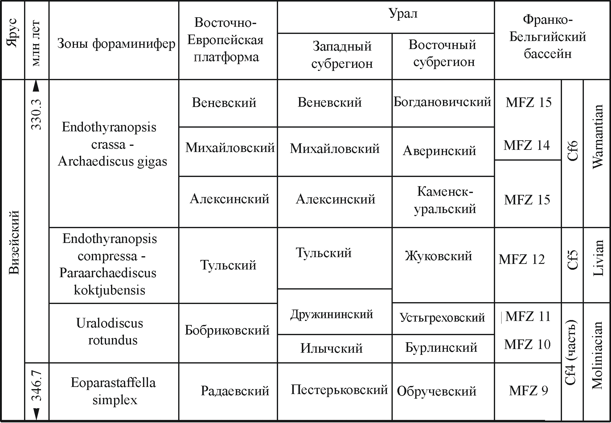 Палеонтологическое обоснование тульского горизонта важно и для межрегиональной корреляции визейского яруса. В ОСШ России визейский ярус делится на два подъяруса (Решение…, 1990; Стратиграфические схемы Урала…, 1993), и тульский горизонт начинает верхний подъярус. В стратотипическом регионе во Франко-Бельгийском бассейне визейский ярус включает три подразделения, а тульский горизонт коррелируется со средним – ливийским (Livian) подъярусом (Poty et al., 2006). Поэтому желательно привести подразделения России в соответствие с международным стандартом.