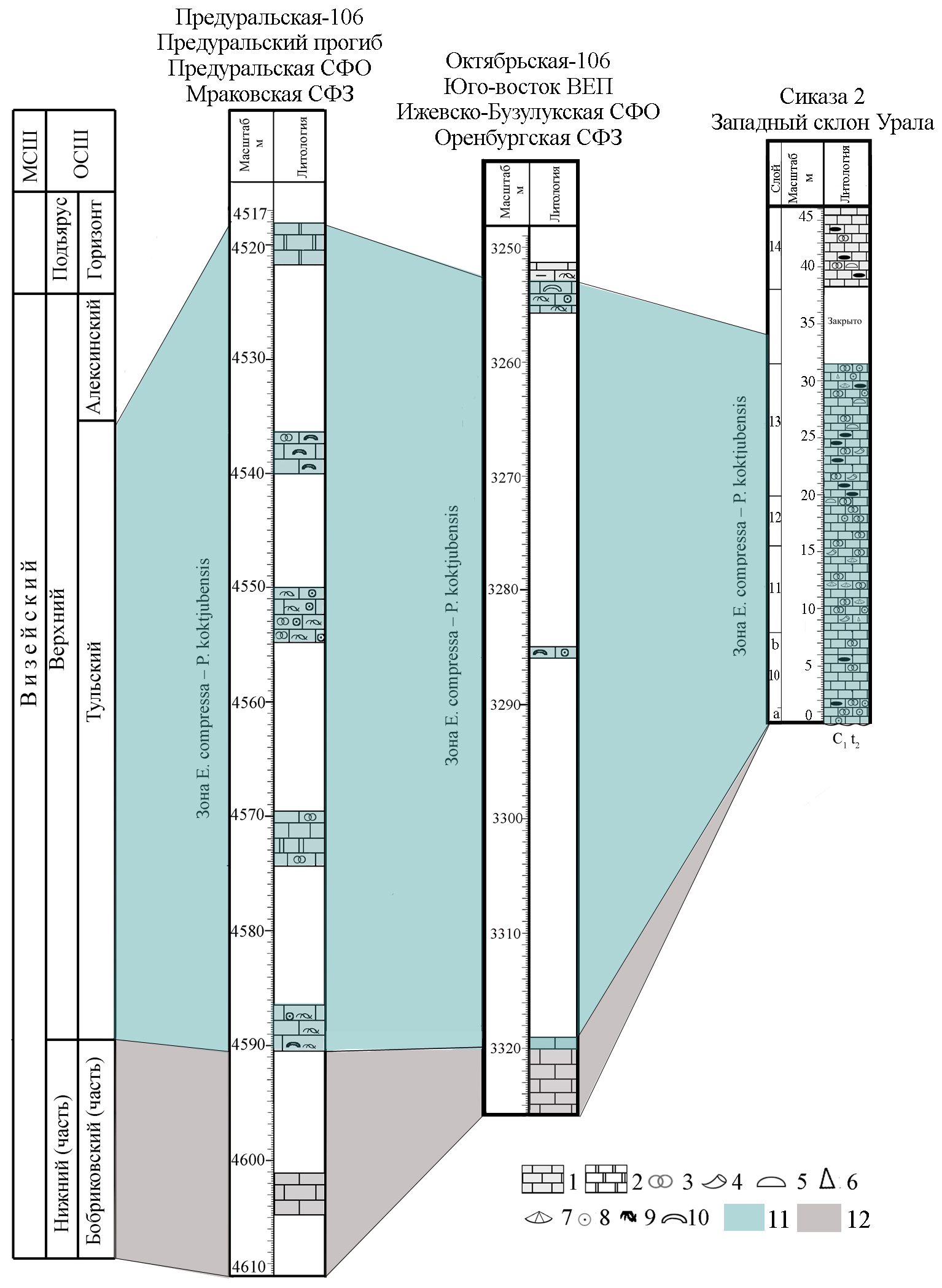 Рис. 10. Корреляция разрезов тульского горизонта скважин Предуральская-106, Октябрьская-106, разреза Сиказа 2. Условные обозначения:1 – известняки, 2 – доломиты, 3 – фораминиферы, 4 – одиночные кораллы, 5 – колониальные кораллы, 6 – гастроподы, 7 – брахиоподы, 8 – криноидеи, 9 – водоросли, 10 – остракоды, 11 – тульский горизонт, 12 – бобриковский горизонт