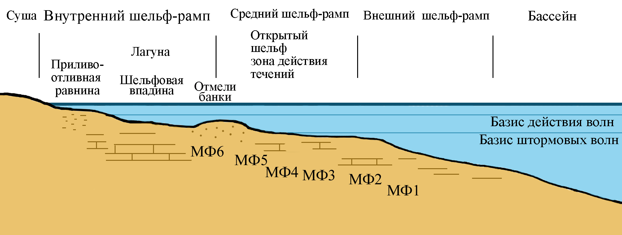 Рис. 9. Модель строения шельфа рампового типа по (Flügel, 2010) с распределением микрофаций (МФ) известняков изученных разрезов