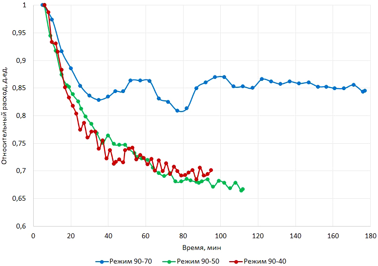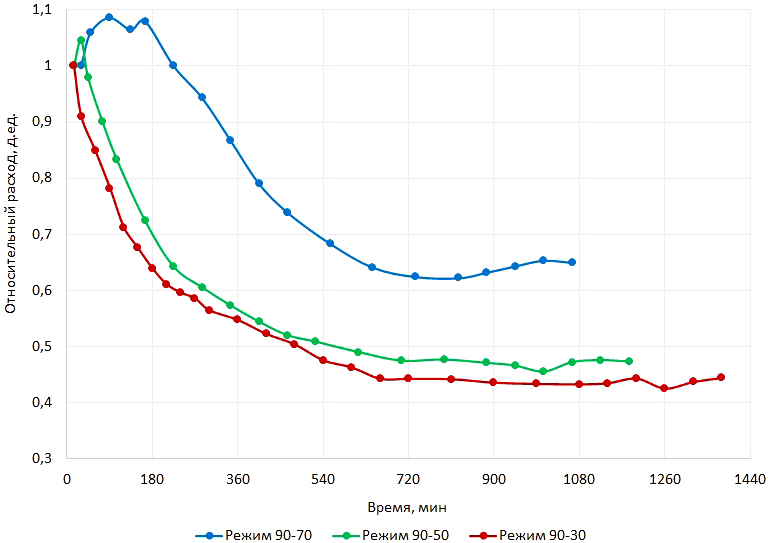 Динамики изменения расхода во времени в относительной шкале для песчаников на режимах с давлением отбора 70, 50 и 40 бар приведены на рис. 4. Расходы в моменты выхода на целевое давление, т.е. приблизительно через 4–7 мин после начала двухфазного эксперимента, являются максимальными и соответствуют на рис. 4 относительному расходу, равному единице. Вследствие высокой продуктивности керновой модели песчаников и ограниченного объёма рекомбинированной пробы, с учётом также максимального расхода плунжерного насоса, вместо режима с давлением отбора 30 бар исследован режим с давлением отбора 40 бар.
