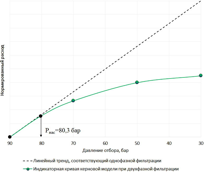 Рис. 3. Гипотетический вид искомых индикаторных зависимостей для керновой модели при однофазной и двухфазной фильтрации (индикаторная кривая двухфазной фильтрации закономерно отклоняется от линейного тренда однофазной фильтрации при давлении отбора ниже давления насыщения Рнас, равного 80,3 бар)