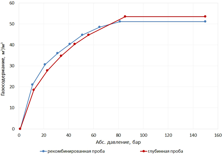 В рассматриваемой серии экспериментов для подготовки рекомбинированных проб использовалась поверочная газовая смесь, состоящая из наиболее слаборастворимых компонентов нефтяного газа (азот, метан, этан, пропан) в относительных концентрациях, соответствующих составу нефтяного газа, полученного при однократном разгазировании глубинной пробы. Такой подход к приготовлению модели пластовой нефти обоснован тем, что при снижении давления ниже давления насыщения в первую очередь выделяются из нефти преимущественно слаборастворимые компоненты. Газосодержание рекомбинированной пробы было подобрано таким образом, чтобы её давление насыщения было близким к давлению насыщения пластовой нефти. Зависимости газосодержания от давления, полученные по результатам дифференциального разгазирования рекомбинированной и глубинной проб, представлены на рис. 2. Как видно из рисунка, свойства рекомбинированной пробы достаточно хорошо воспроизводят свойства пластовой нефти.